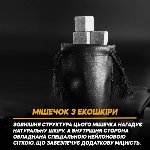 Кожа не используется, так-как она трескается при минусовых температурах. Так же не используем ткань - она впитывает посторонние запахи из морозильной камеры, а так же ворсинки намерзают на камни и все это попадает в виски.